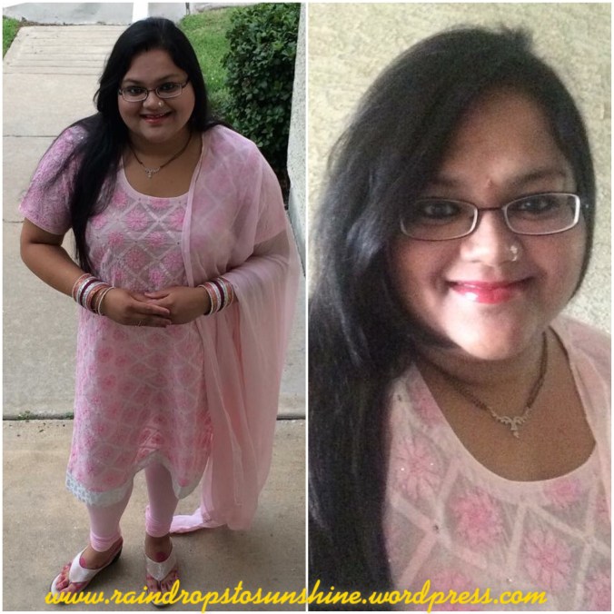 This was my look for Karvachauth 2 years ago (2014). This salwar kameez is from a boutique in Lucknow and is my mother-in-law’s choice. I love the simplicity yet festiveness of the baby pink color combined with silver details.