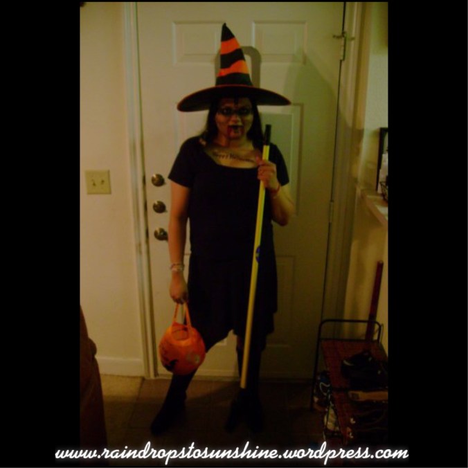 This is one costume I am proud of!! Why you ask?? Well because this is the one costume that has been in line with the horrors of Halloween having made kids cry and be so scared of me, they won’t come close to me, let alone take treats!! Haha!! Everything I am wearing, except the witch hat is from my very own closet. The witch hat is from Walmart. That broom is the very one I use to clean my kitchen, don’t forget to look around the house for accessories before going to buy some!! I used a lot of Kajal (Kohl) and long wear red lipstick to get the look.