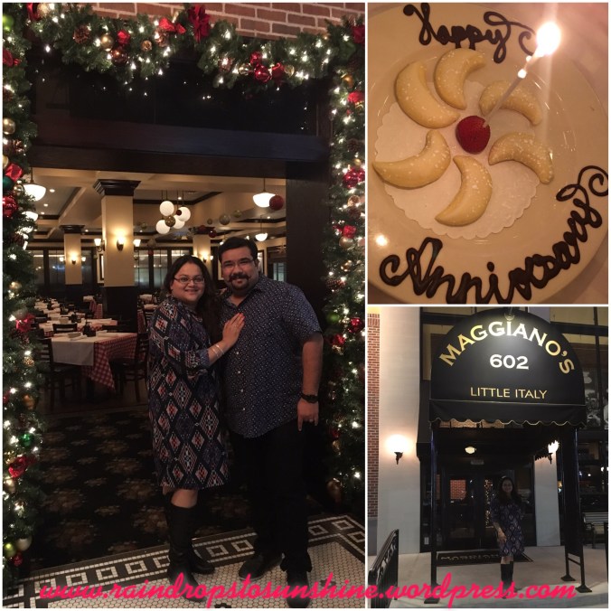 Our anniversary was on a Monday, so once the hubby got home from work, we head out for a cute simple romantic dinner at a new Italian restaurant that opened up at the Memorial City Mall. We had eaten at Maggiano’s Little Italy in Denver and hence were excited when it opened up here in Houston!