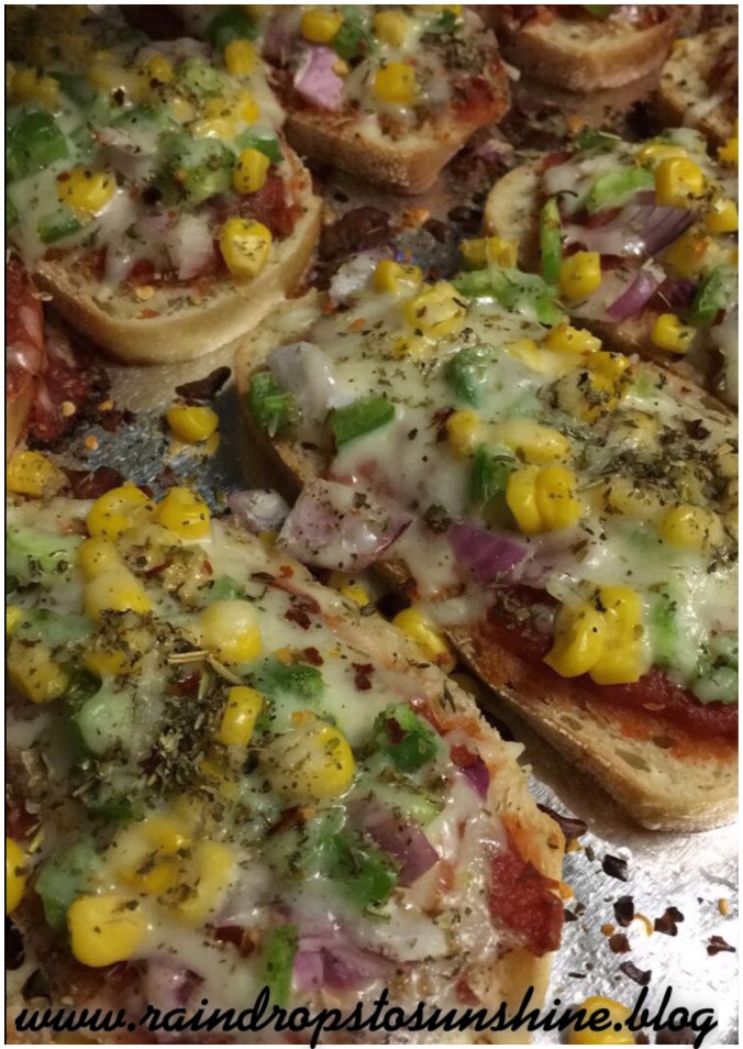 – Line the French bread on the baking tray, keeping a little bit of distance between the piece so as the melted cheese from one doesn’t stick to another