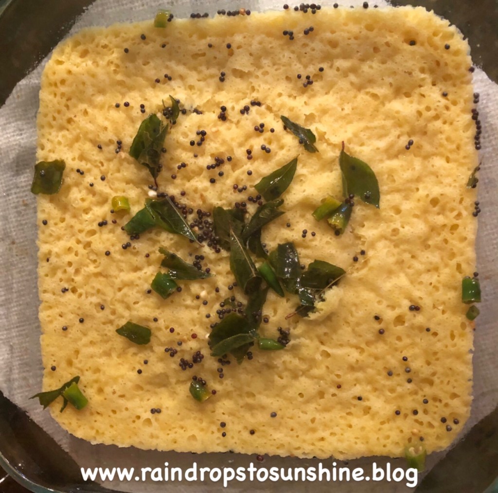 – Switch off the flame and pour this on the microwaved Dhokla, letting it soak. Let it sit for 5 minutes and then once cool, garnish with cilantro, cut into pieces and serve them with chutney or just as is!